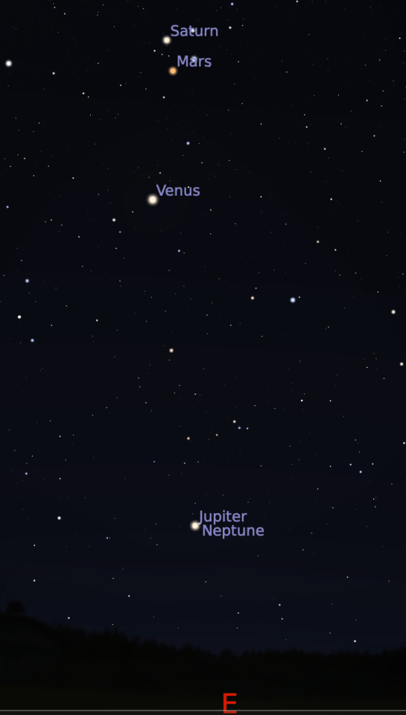 Now, next stop is my favourite orb, Jupiter, lolloping 10 degrees above due East. While Jupiter has been surpassed by Saturn for the most number of moons, it still has the honour of being the largest planet in our Solar System with the largest moon, Ganymede; it is also possible in binoculars to see its 4 largest moons. As an added bonus, while low to the horizon by 5:30am, try looking to the SW of Jupiter on Wednesday to see whether you can find the faint blue Neptune less than 0.1 degrees away; it appears blue due to the absorption of red and infrared light by its methane (phew) atmosphere, see screenshot below.