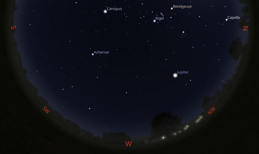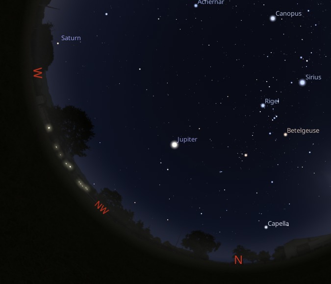 Jupiter is still the most prominent celestial object dominating the NNW horizon by 8pm when it can be found sitting 40 degrees up. …..that’s four stacked clenched fists at arm’s length, each being 10 degrees.