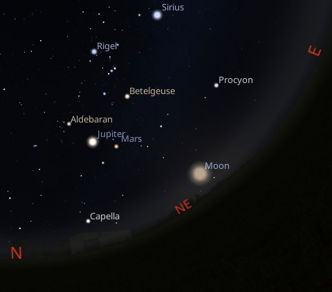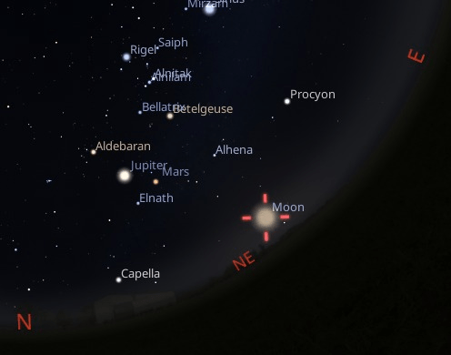 As one either heads to, or arrives at work, the skies east of due north present a veritable feast of naked eye or binocular objects around 5am.