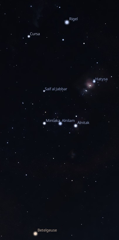 From Mars, lift one’s eyes up 25 deg. to find the middle of the constellation of Orion and its ‘saucepan’ appearance. Use the 3 belt stars, that make the bottom of the saucepan, to direct you the ESE 25 deg. to find the brightest star in the night sky, Sirius, the name derived from the Latin word “Seirios”, or “Lit”.